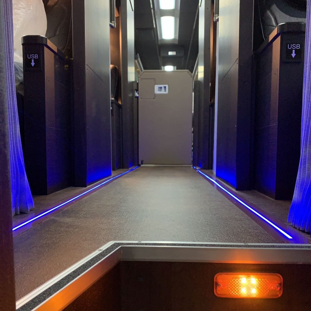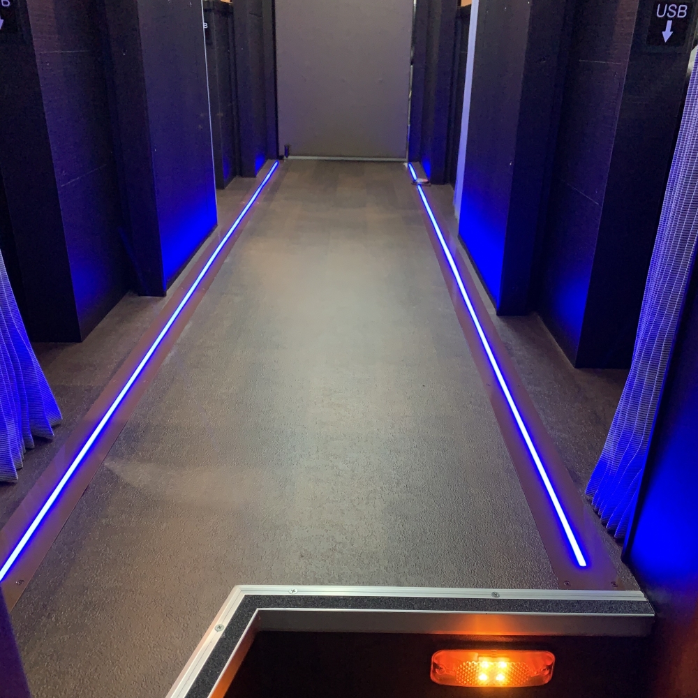 バス通路灯 は、汎用テープライト「RIO LIGHT NEO」を採用し、床に埋め込み設置できる LEDフロアライト です。専用の防水ケースに収納することで耐久性・防水性を確保。夜間や暗所でも通路を明るく照らし、乗客の安全性向上と転倒防止に貢献します。