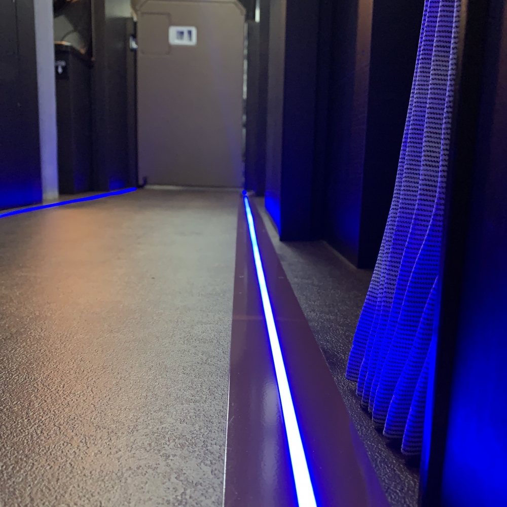 バス通路灯 は、汎用テープライト「RIO LIGHT NEO」を採用し、床に埋め込み設置できる LEDフロアライト です。専用の防水ケースに収納することで耐久性・防水性を確保。夜間や暗所でも通路を明るく照らし、乗客の安全性向上と転倒防止に貢献します。